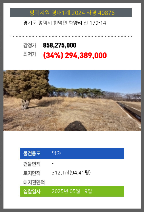 사건번호 2024 타경 40876 본건은 경기도 평택시 현덕면 화양리 산 179-14소재하는 임야경매 물건의 포스팅입니다. 토지면적 [ 312.1㎡ (94.41평) ] 시세를 반영한 감정가 858,275,000에서3회 유찰되어 감정가
