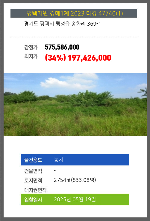 사건번호 2023 타경 47740(1) 본건은 경기도 평택시 팽성읍 송화리 369-1소재하는 농지경매 물건의 포스팅입니다. 토지면적 [ 2754㎡ (833.08평) ] 시세를 반영한 감정가 575,586,000에서3회 유찰되어 감정가 대비