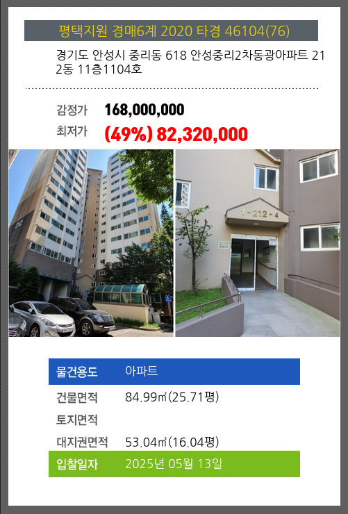 사건번호 2020 타경 46104(76) 본건은 경기도 안성시 중리동 618 안성중리2차동광아파트 212동 11층1104호소재하는 아파트경매 물건의 포스팅입니다. 건물면적 [ 84.99㎡ (25.71평) ]대지권 [ 53.04㎡ (16.04평) ] 시세를