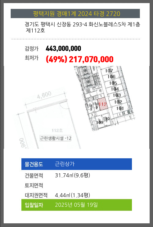 사건번호 2024 타경 2720 본건은 경기도 평택시 신장동 293-4 화신노블레스5차 제1층 제112호소재하는 근린상가경매 물건의 포스팅입니다. 건물면적 [ 31.74㎡ (9.6평) ]대지권 [ 4.44㎡ (1.34평) ] 시세를