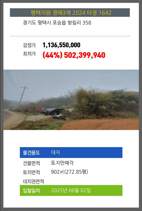 사건번호 2024 타경 1642 본건은 경기도 평택시 포승읍 방림리 358소재하는 대지경매 물건의 포스팅입니다. 건물면적 [ 토지만매각 ]토지면적 [ 902㎡ (272.85평) ] 시세를 반영한 감정가 1,136,550,000에서2회