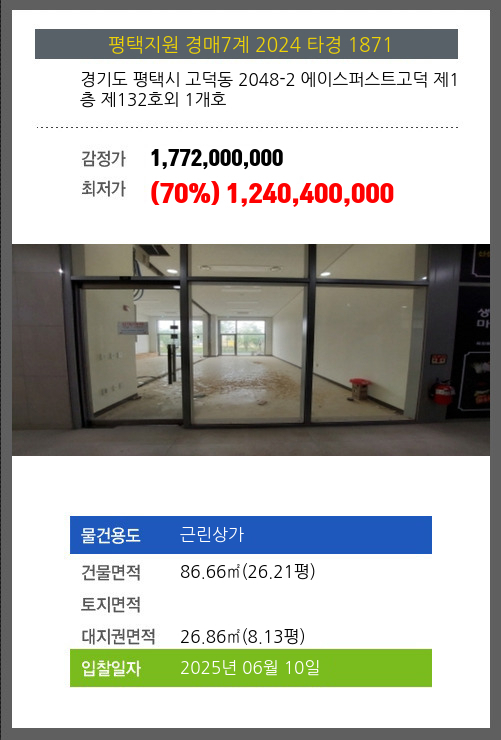 사건번호 2024 타경 1871 본건은 경기도 평택시 고덕동 2048-2 에이스퍼스트고덕 제1층 제132호외 1개호소재하는 근린상가경매 물건의 포스팅입니다. 건물면적 [ 86.66㎡ (26.21평) ]대지권 [ 26.86㎡ (8.13평) ]