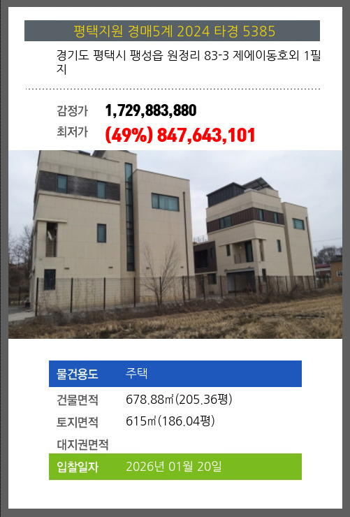 사건번호 2024 타경 5385 본건은 경기도 평택시 팽성읍 원정리 83-3 제에이동호외 1필지소재하는 주택경매 물건의 포스팅입니다. 건물면적 [ 678.88㎡ (205.36평) ]토지면적 [ 615㎡ (186.04평) ] 시세를