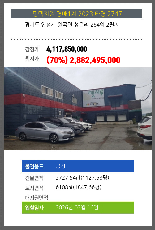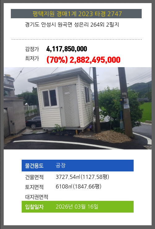 사건번호 2023 타경 2747 본건은 경기도 안성시 원곡면 성은리 264외 2필지소재하는 공장경매 물건의 포스팅입니다. 건물면적 [ 3727.54㎡ (1127.58평) ]토지면적 [ 6108㎡ (1847.66평) ] 시세를 반영한