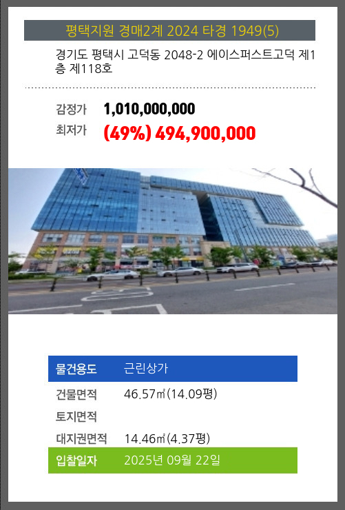 사건번호 2024 타경 1949(5) 본건은 경기도 평택시 고덕동 2048-2 에이스퍼스트고덕 제1층 제118호소재하는 근린상가경매 물건의 포스팅입니다. 건물면적 [ 46.57㎡ (14.09평) ]대지권 [ 14.46㎡ (4.37평) ] 시세를