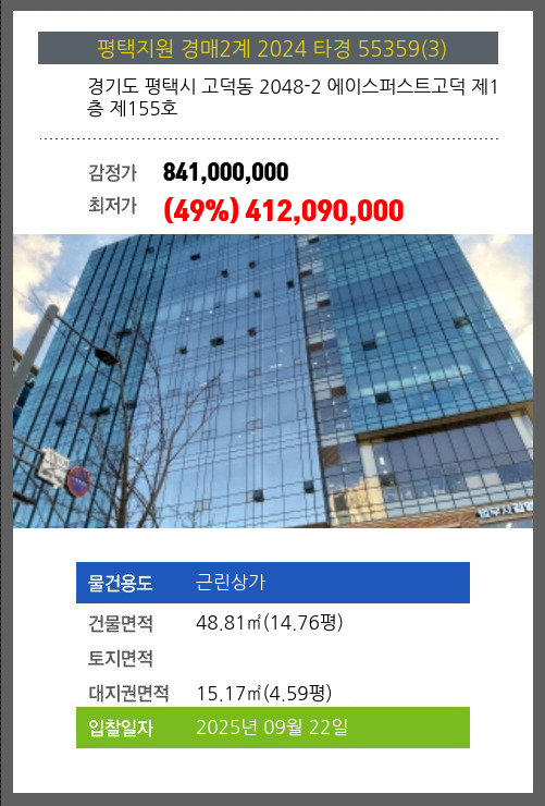 사건번호 2024 타경 55359(3) 본건은 경기도 평택시 고덕동 2048-2 에이스퍼스트고덕 제1층 제155호소재하는 근린상가경매 물건의 포스팅입니다. 건물면적 [ 48.81㎡ (14.76평) ]대지권 [ 15.17㎡ (4.59평) ] 시세를