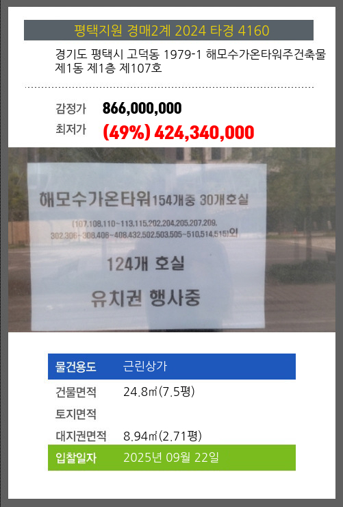사건번호 2024 타경 4160 본건은 경기도 평택시 고덕동 1979-1 해모수가온타워주건축물제1동 제1층 제107호소재하는 근린상가경매 물건의 포스팅입니다. 건물면적 [ 24.8㎡ (7.5평) ]대지권 [ 8.94㎡ (2.71평) ] 시세를