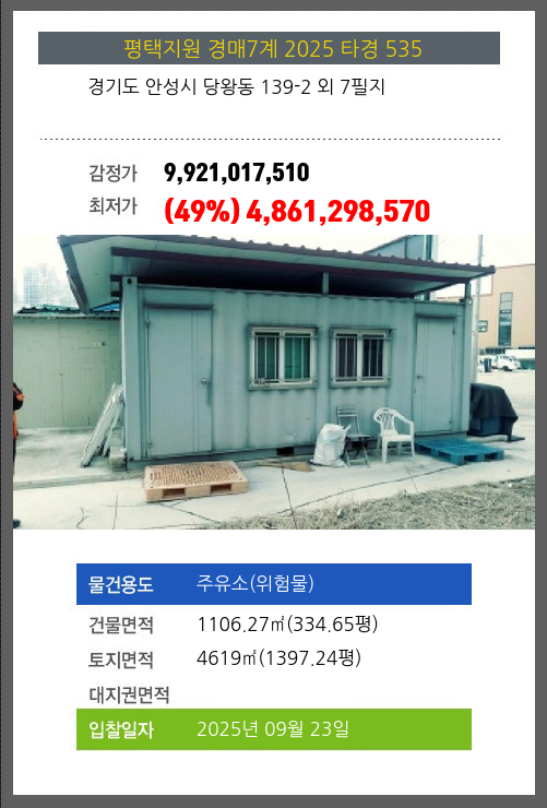 사건번호 2025 타경 535 본건은 경기도 안성시 당왕동 139-2 외 7필지소재하는 주유소(위험물)경매 물건의 포스팅입니다. 건물면적 [ 1106.27㎡ (334.65평) ]토지면적 [ 4619㎡ (1397.24평) ] 시세를 반영한