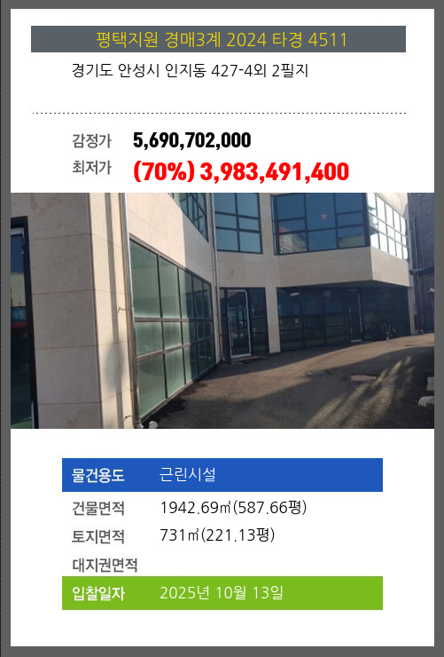 사건번호 2024 타경 4511 본건은 경기도 안성시 인지동 427-4외 2필지소재하는 근린시설경매 물건의 포스팅입니다. 건물면적 [ 1942.69㎡ (587.66평) ]토지면적 [ 731㎡ (221.13평) ] 시세를 반영한 감정가