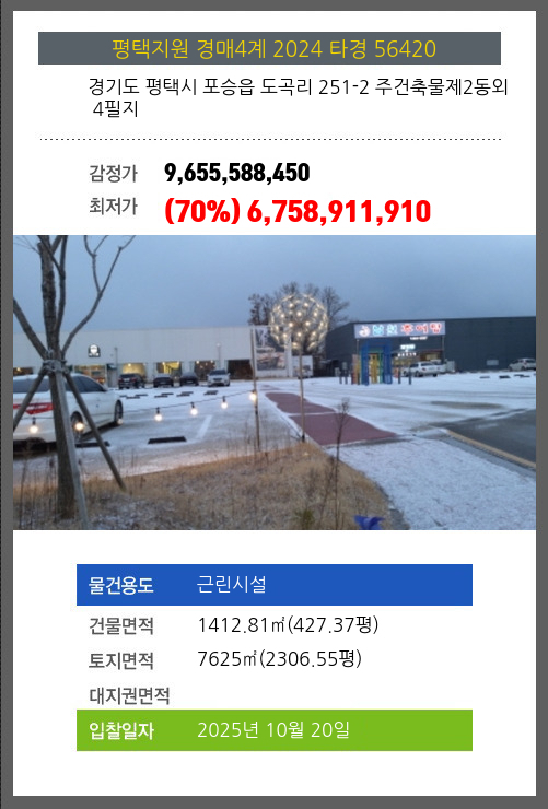 사건번호 2024 타경 56420 본건은 경기도 평택시 포승읍 도곡리 251-2 주건축물제2동외 4필지소재하는 근린시설경매 물건의 포스팅입니다. 건물면적 [ 1412.81㎡ (427.37평) ]토지면적 [ 7625㎡ (2306.55평) ] 시세를