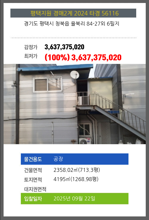 사건번호 2024 타경 56116 본건은 경기도 평택시 청북읍 율북리 84-27외 6필지소재하는 공장경매 물건의 포스팅입니다. 건물면적 [ 2358.02㎡ (713.3평) ]토지면적 [ 4195㎡ (1268.98평) ] 시세를 반영한