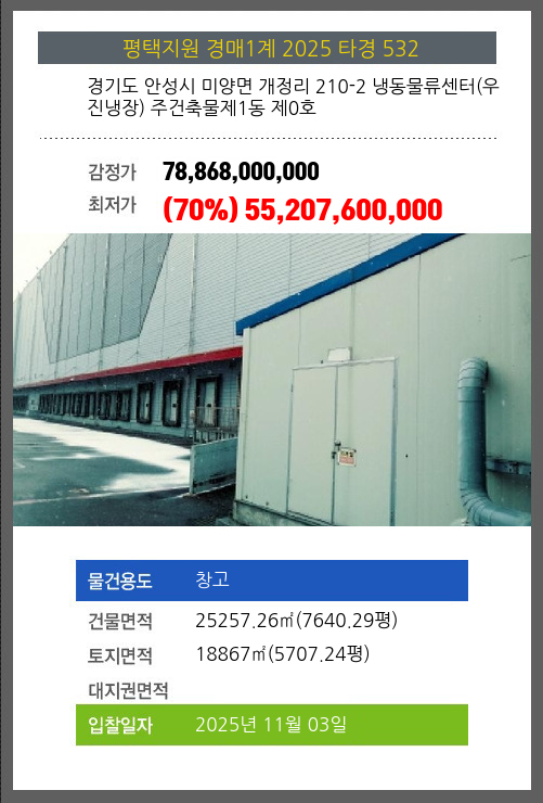 사건번호 2025 타경 532 본건은 경기도 안성시 미양면 개정리 210-2 냉동물류센터(우진냉장) 주건축물제1동 제0호소재하는 창고경매 물건의 포스팅입니다. 건물면적 [ 25257.26㎡ (7640.29평) ]토지면적 [ 18867㎡ (5707.24평) ]