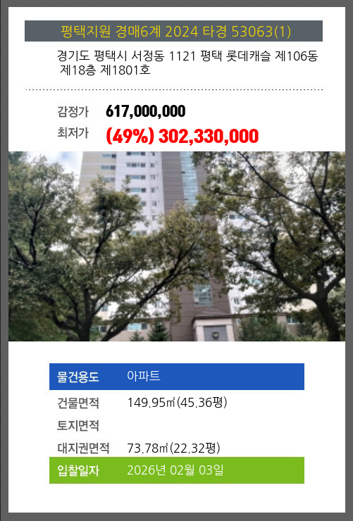 사건번호 2024 타경 53063(1) 본건은 경기도 평택시 서정동 1121 평택 롯데캐슬 제106동 제18층 제1801호소재하는 아파트경매 물건의 포스팅입니다. 건물면적 [ 149.95㎡ (45.36평) ]대지권 [ 73.78㎡ (22.32평)