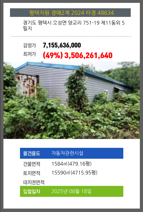 사건번호 2024 타경 48634 본건은 경기도 평택시 오성면 양교리 751-19 제11동외 5필지소재하는 자동차관련시설경매 물건의 포스팅입니다. 건물면적 [ 1584㎡ (479.16평) ]토지면적 [ 15590㎡ (4715.95평) ] 시세를