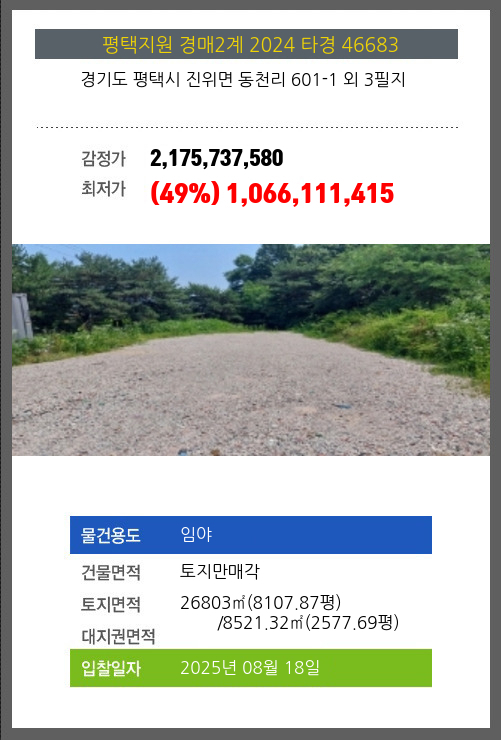 사건번호 2024 타경 46683 본건은 경기도 평택시 진위면 동천리 601-1 외 3필지소재하는 임야경매 물건의 포스팅입니다. 건물면적 [ 토지만매각 ]토지면적 [ 전체:26803㎡ (8107.87평) 매각지분:8521.32㎡ (2577.69평) ]