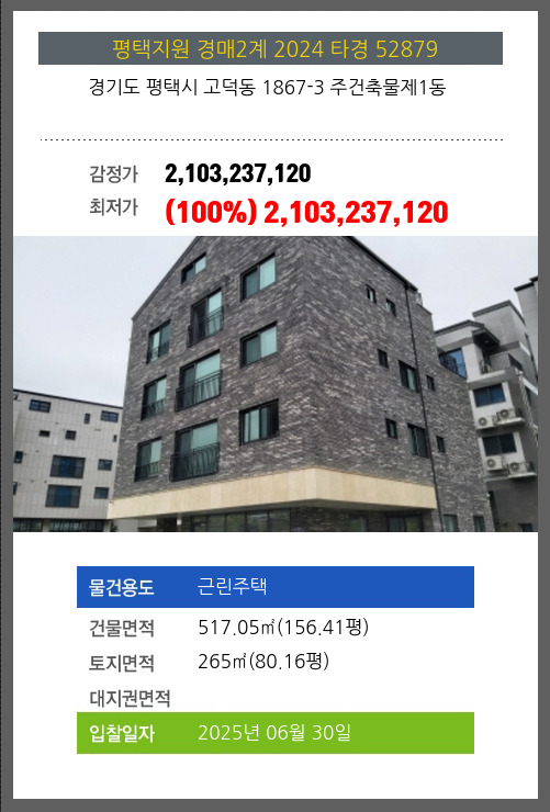 사건번호 2024 타경 52879 본건은 경기도 평택시 고덕동 1867-3 주건축물제1동소재하는 근린주택경매 물건의 포스팅입니다. 건물면적 [ 517.05㎡ (156.41평) ]토지면적 [ 265㎡ (80.16평) ] 시세를 반영한 감정가