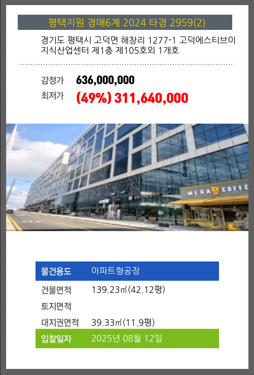 사건번호 2024 타경 2959(2) 본건은 경기도 평택시 고덕면 해창리 1277-1 고덕에스티브이지식산업센터 제1층 제105호외 1개호소재하는 아파트형공장경매 물건의 포스팅입니다. 건물면적 [ 139.23㎡ (42.12평) ]대지권 [ 39.33㎡ (11.9평)