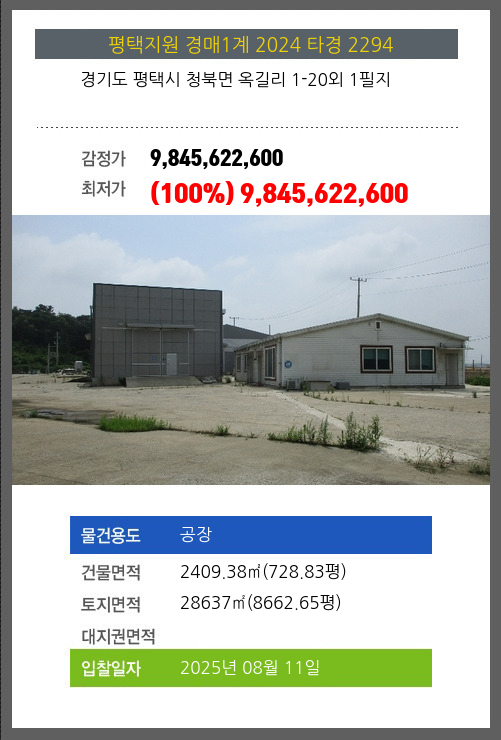 사건번호 2024 타경 2294 본건은 경기도 평택시 청북면 옥길리 1-20외 1필지소재하는 공장경매 물건의 포스팅입니다. 건물면적 [ 2409.38㎡ (728.83평) ]토지면적 [ 28637㎡ (8662.65평) ] 시세를 반영한