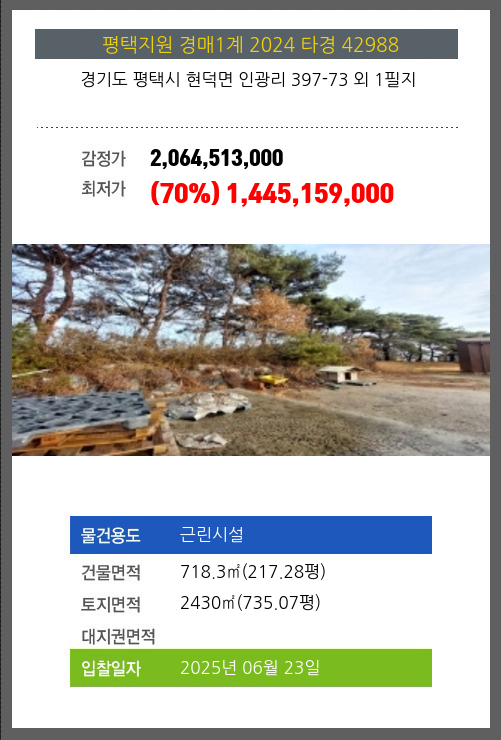 사건번호 2024 타경 42988 본건은 경기도 평택시 현덕면 인광리 397-73 외 1필지소재하는 근린시설경매 물건의 포스팅입니다. 건물면적 [ 718.3㎡ (217.28평) ]토지면적 [ 2430㎡ (735.07평) ] 시세를