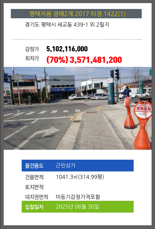 사건번호 2017 타경 1422(1) 본건은 경기도 평택시 세교동 439-1 외 2필지소재하는 근린상가경매 물건의 포스팅입니다. 건물면적 [ 1041.3㎡ (314.99평) ]대지권 [ 미등기감정가격포함 ] 시세를 반영한 감정가