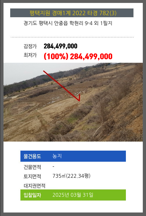사건번호 2022 타경 782(3) 본건은 경기도 평택시 안중읍 학현리 9-4 외 1필지소재하는 농지경매 물건의 포스팅입니다. 토지면적 [ 735㎡ (222.34평) ] 시세를 반영한 감정가 284,499,000에서1회 유찰되어