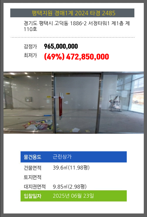 사건번호 2024 타경 2485 본건은 경기도 평택시 고덕동 1886-2 서정타워1 제1층 제110호소재하는 근린상가경매 물건의 포스팅입니다. 건물면적 [ 39.6㎡ (11.98평) ]대지권 [ 9.85㎡ (2.98평) ] 시세를