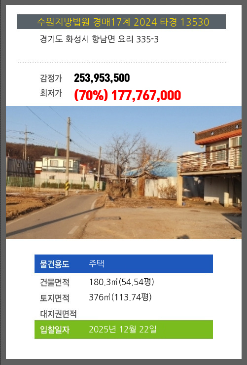 사건번호 2024 타경 13530 본건은 경기도 화성시 향남면 요리 335-3소재하는 주택경매 물건의 포스팅입니다. 건물면적 [ 180.3㎡ (54.54평) ]토지면적 [ 376㎡ (113.74평) ] 시세를 반영한 감정가