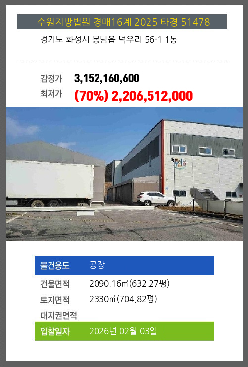 사건번호 2025 타경 51478 본건은 경기도 화성시 봉담읍 덕우리 56-1 1동소재하는 공장경매 물건의 포스팅입니다. 건물면적 [ 2090.16㎡ (632.27평) ]토지면적 [ 2330㎡ (704.82평) ] 시세를 반영한