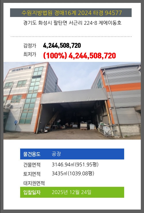 사건번호 2024 타경 94577 본건은 경기도 화성시 팔탄면 서근리 224-8 제에이동호소재하는 공장경매 물건의 포스팅입니다. 건물면적 [ 3146.94㎡ (951.95평) ]토지면적 [ 3435㎡ (1039.08평) ] 시세를 반영한