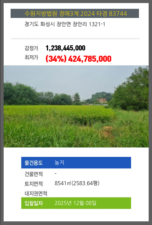 사건번호 2024 타경 83744 본건은 경기도 화성시 장안면 장안리 1321-1소재하는 농지경매 물건의 포스팅입니다. 토지면적 [ 8541㎡ (2583.64평) ] 시세를 반영한 감정가 1,238,445,000에서3회 유찰되어 감정가 대비