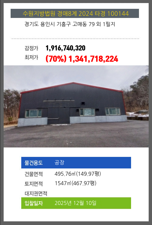 사건번호 2024 타경 100144 본건은 경기도 용인시 기흥구 고매동 79 외 1필지소재하는 공장경매 물건의 포스팅입니다. 건물면적 [ 495.76㎡ (149.97평) ]토지면적 [ 1547㎡ (467.97평) ] 시세를