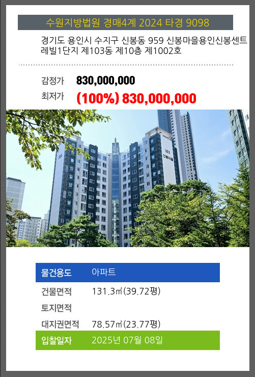 사건번호 2024 타경 9098 본건은 경기도 용인시 수지구 신봉동 959 신봉마을용인신봉센트레빌1단지 제103동 제10층 제1002호소재하는 아파트경매 물건의 포스팅입니다. 건물면적 [ 131.3㎡ (39.72평) ]대지권 [ 78.57㎡ (23.77평)