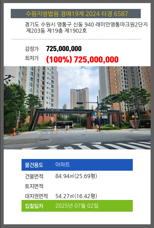 사건번호 2024 타경 6587 본건은 경기도 수원시 영통구 신동 940 래미안영통마크원2단지 제203동 제19층 제1902호소재하는 아파트경매 물건의 포스팅입니다. 건물면적 [ 84.94㎡ (25.69평) ]대지권 [ 54.27㎡ (16.42평)
