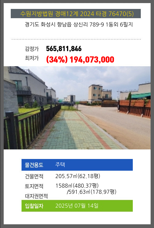 사건번호 2024 타경 76470(5) 본건은 경기도 화성시 향남읍 상신리 789-9 1동외 6필지소재하는 주택경매 물건의 포스팅입니다. 건물면적 [ 205.57㎡ (62.18평) ]토지면적 [ 전체:1588㎡ (480.37평) 매각지분:591.63㎡ (178.97평)