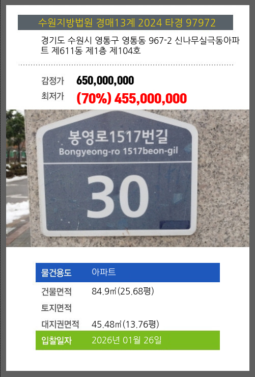사건번호 2024 타경 97972 본건은 경기도 수원시 영통구 영통동 967-2 신나무실극동아파트 제611동 제1층 제104호소재하는 아파트경매 물건의 포스팅입니다. 건물면적 [ 84.9㎡ (25.68평) ]대지권 [ 45.48㎡ (13.76평)