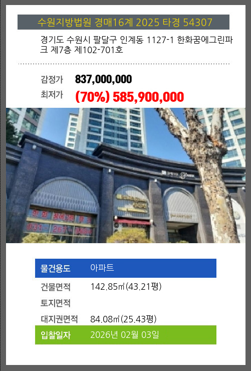 사건번호 2025 타경 54307 본건은 경기도 수원시 팔달구 인계동 1127-1 한화꿈에그린파크 제7층 제102-701호소재하는 아파트경매 물건의 포스팅입니다. 건물면적 [ 142.85㎡ (43.21평) ]대지권 [ 84.08㎡ (25.43평) ]