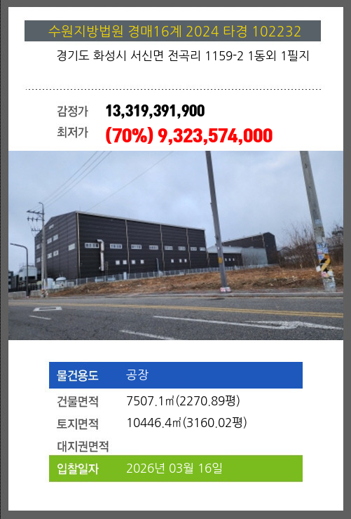 사건번호 2024 타경 102232 본건은 경기도 화성시 서신면 전곡리 1159-2 1동외 1필지소재하는 공장경매 물건의 포스팅입니다. 건물면적 [ 7507.1㎡ (2270.89평) ]토지면적 [ 10446.4㎡ (3160.02평) ] 시세를