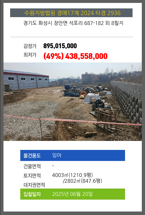 사건번호 2024 타경 2936 본건은 경기도 화성시 장안면 석포리 687-182 외 8필지소재하는 임야경매 물건의 포스팅입니다. 토지면적 [ 전체:4003㎡ (1210.9평) 매각지분:2802㎡ (847.6평) ] 시세를 반영한 감정가