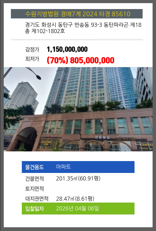 사건번호 2024 타경 85610 본건은 경기도 화성시 동탄구 반송동 93-3 동탄파라곤 제18층 제102-1802호소재하는 아파트경매 물건의 포스팅입니다. 건물면적 [ 201.35㎡ (60.91평) ]대지권 [ 28.47㎡ (8.61평) ]