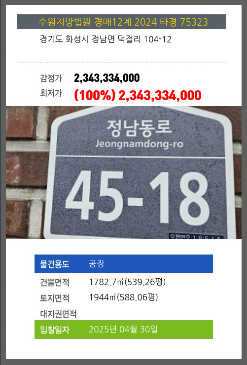 사건번호 2024 타경 75323 본건은 경기도 화성시 정남면 덕절리 104-12소재하는 공장경매 물건의 포스팅입니다. 건물면적 [ 1782.7㎡ (539.26평) ]토지면적 [ 1944㎡ (588.06평) ] 시세를 반영한 감정가