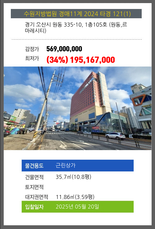 사건번호 2024 타경 121(1) 본건은 경기 오산시 원동 335-10, 1층105호 (원동,르마레시티)소재하는 근린상가경매 물건의 포스팅입니다. 건물면적 [ 35.7㎡ (10.8평) ]대지권 [ 11.86㎡ (3.59평) ] 시세를 반영한