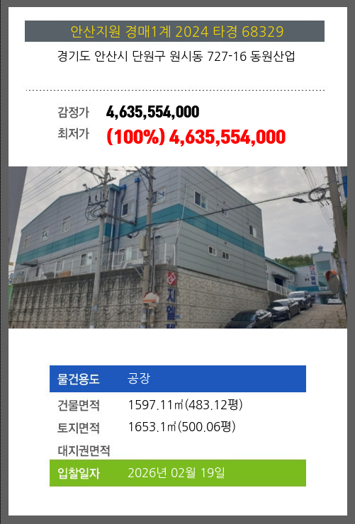 사건번호 2024 타경 68329 본건은 경기도 안산시 단원구 원시동 727-16 동원산업소재하는 공장경매 물건의 포스팅입니다. 건물면적 [ 1597.11㎡ (483.12평) ]토지면적 [ 1653.1㎡ (500.06평) ] 시세를 반영한