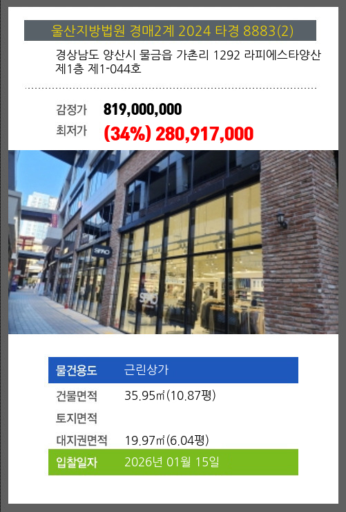 사건번호 2024 타경 8883(2) 본건은 경상남도 양산시 물금읍 가촌리 1292 라피에스타양산 제1층 제1-044호소재하는 근린상가경매 물건의 포스팅입니다. 건물면적 [ 35.95㎡ (10.87평) ]대지권 [ 19.97㎡ (6.04평) ]
