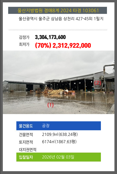 사건번호 2024 타경 103061 본건은 울산광역시 울주군 삼남읍 상천리 427-45외 1필지소재하는 공장경매 물건의 포스팅입니다. 건물면적 [ 2109.9㎡ (638.24평) ]토지면적 [ 6174㎡ (1867.63평) ] 시세를 반영한