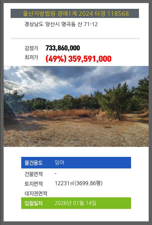 사건번호 2024 타경 118568 본건은 경상남도 양산시 명곡동 산 71-12소재하는 임야경매 물건의 포스팅입니다. 토지면적 [ 12231㎡ (3699.86평) ] 시세를 반영한 감정가 733,860,000에서2회 유찰되어 감정가 대비