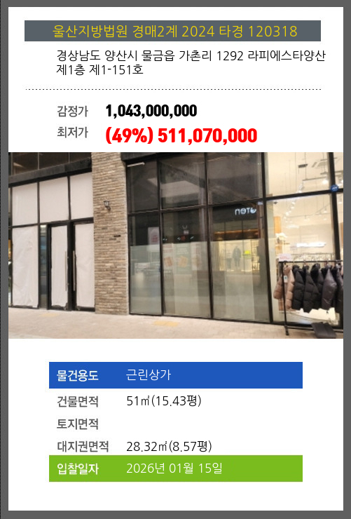 사건번호 2024 타경 120318 본건은 경상남도 양산시 물금읍 가촌리 1292 라피에스타양산 제1층 제1-151호소재하는 근린상가경매 물건의 포스팅입니다. 건물면적 [ 51㎡ (15.43평) ]대지권 [ 28.32㎡ (8.57평) ]