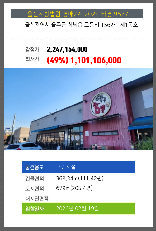 사건번호 2024 타경 9527 본건은 울산광역시 울주군 삼남읍 교동리 1562-1 제1동호소재하는 근린시설경매 물건의 포스팅입니다. 건물면적 [ 368.34㎡ (111.42평) ]토지면적 [ 679㎡ (205.4평) ] 시세를 반영한