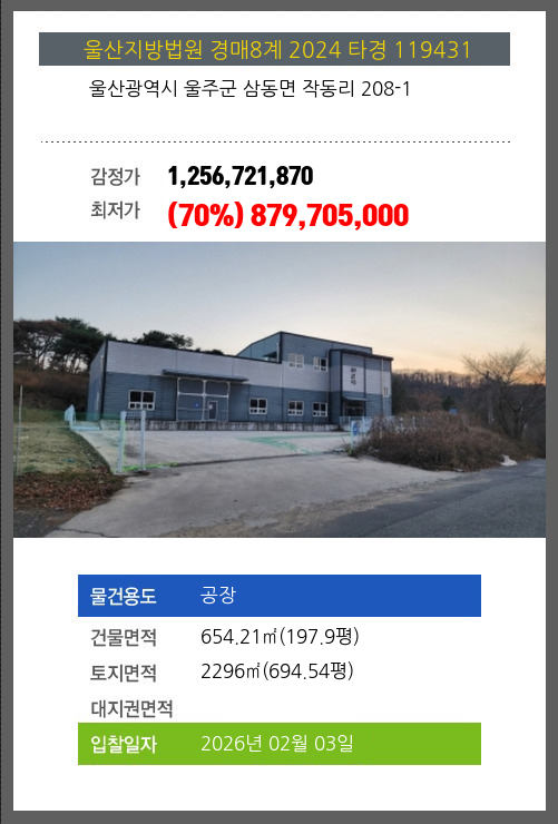 사건번호 2024 타경 119431 본건은 울산광역시 울주군 삼동면 작동리 208-1소재하는 공장경매 물건의 포스팅입니다. 건물면적 [ 654.21㎡ (197.9평) ]토지면적 [ 2296㎡ (694.54평) ] 시세를 반영한 감정가