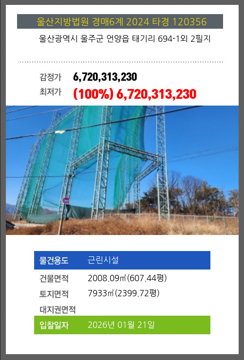 사건번호 2024 타경 120356 본건은 울산광역시 울주군 언양읍 태기리 694-1외 2필지소재하는 근린시설경매 물건의 포스팅입니다. 건물면적 [ 2008.09㎡ (607.44평) ]토지면적 [ 7933㎡ (2399.72평) ] 시세를 반영한