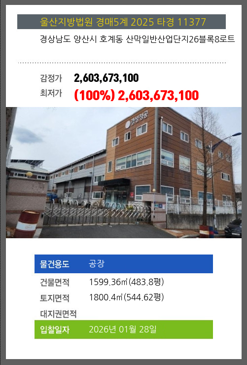 사건번호 2025 타경 11377 본건은 경상남도 양산시 호계동 산막일반산업단지26블록8로트소재하는 공장경매 물건의 포스팅입니다. 건물면적 [ 1599.36㎡ (483.8평) ]토지면적 [ 1800.4㎡ (544.62평) ] 시세를 반영한 감정가 2,603,673,100에서신건으로
